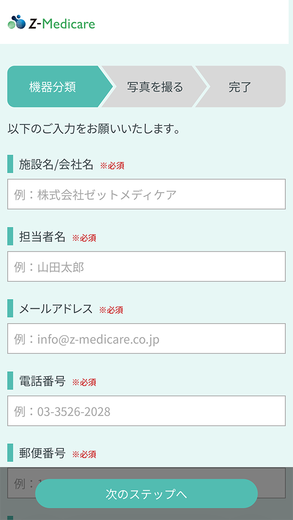 QRからアクセスし、フォームに従って施設名・所在地・連絡先・査定する機器の情報などを入力します。
